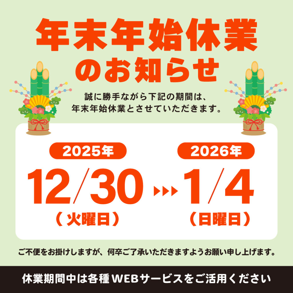 年末年始の営業につきまして、下記の期間は全店休業とさせていただきます。